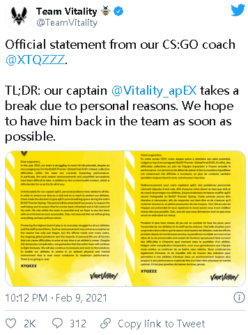 不久后,队伍的教练XTQZZZ也发表声明,战队成员apEx将不再参加BLAST Premier春季赛剩下的赛事,并且存在更长时间休息的可能。XTQZZZ解释道:这次休息的主要原因是因为个人的身心健康,指挥apEx在队伍中是非常重要的角色,团队希望他能尽快恢复状态。