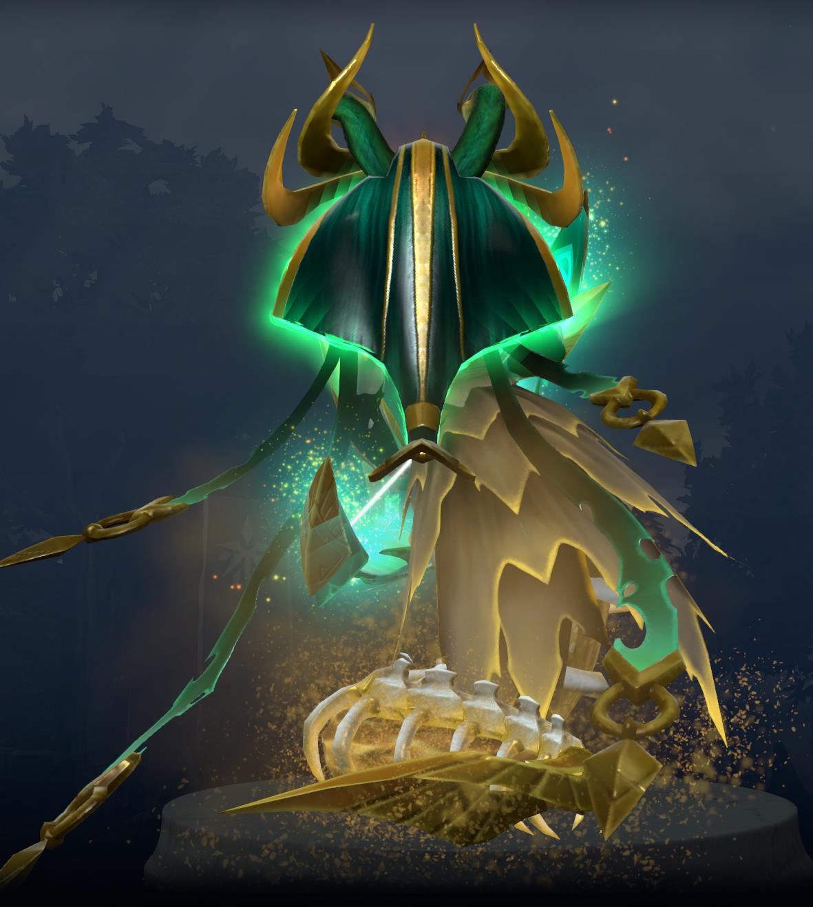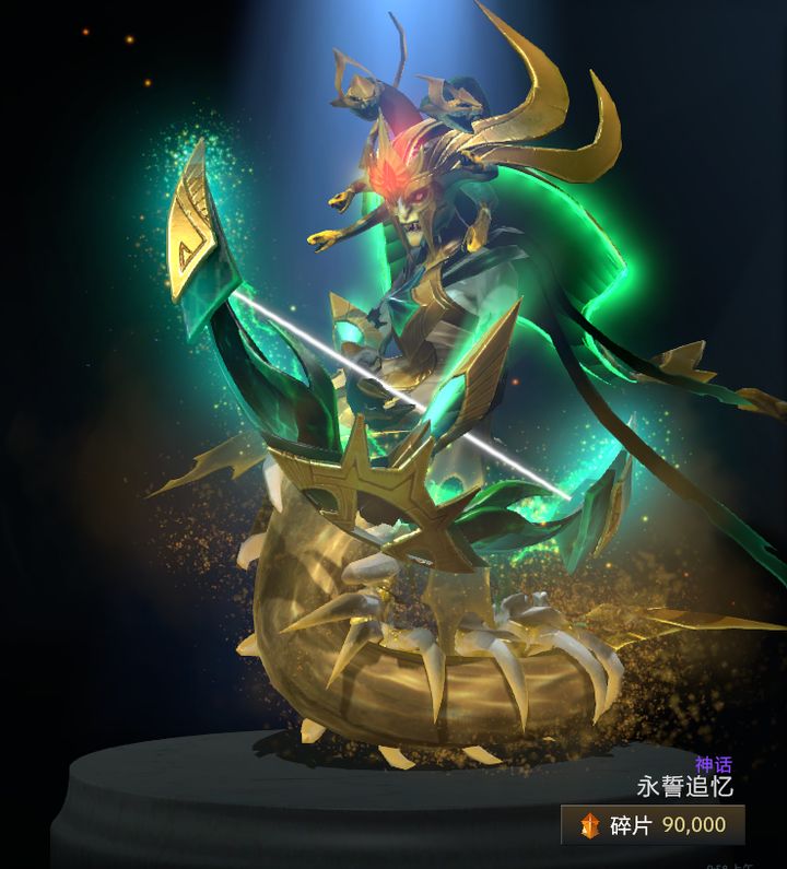 永誓追忆抛弃了V社常用的传统配色方案,改用了金色与高亮翠绿色的新颖搭配,即沿袭了美杜莎最原始的碧绿配色,又做到了视觉效果上的改进,色彩选得相当合适。需要注意的是,美杜莎在这个套装上的金色和一般高亮高闪的金色不朽有着很明显的区别,金色不朽更侧重于闪光,而这一套,则用了粉尘类的特效包裹,淡化了纯金色本身的影响,从另一个方面增加了饰品的诱惑力和神秘感。