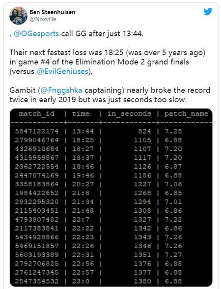 有职业分析师晒出了OG敲出GG时间的相关数据,从图片中可以看出,上一次的最快失利记录是18分25秒,时间在5年前,比赛ID为2799046764,当时OG在2016年对抗EG的一场比赛中,18分钟出头敲出GG,由于比赛是BO5,最后的胜利还是被OG拿下了。再就是18年,Fng领衔的Gambit分别以18分27秒和18分37秒的成绩战胜了OG。