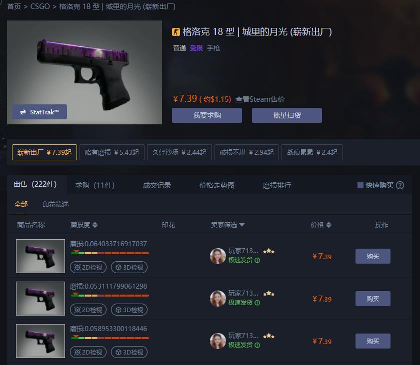 磨损方面,城里的月光有着典型的磨损二相性,高磨和低磨损之间差距显著,然而这是一款入门皮肤,最好的消息在于即便是你要入手崭新款,价位都是白菜,所以你要是用来玩耍的,完全不用去刻意考虑磨损,直接崭新款走起就完事了。